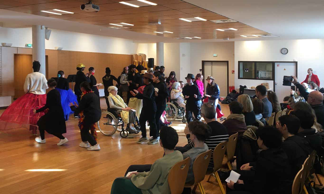 Les élèves de la 4eB du collège Georges Seurat ont eu la chance de participer, dans le cadre du dispositif Chemins des arts, à une comédie musicale supervisée par Madame Montagne, notre professeure de français et professeure principale.