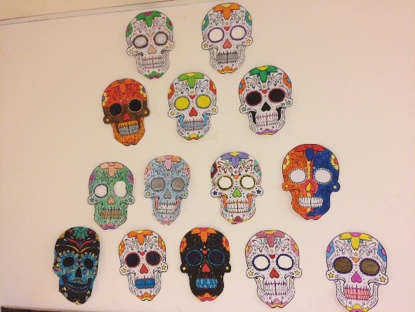 Nous avons décoré nos cahiers et la classe avec des têtes de mort. Pendant la fête des morts, les mexicains décorent leurs maisons avec des têtes de morts.