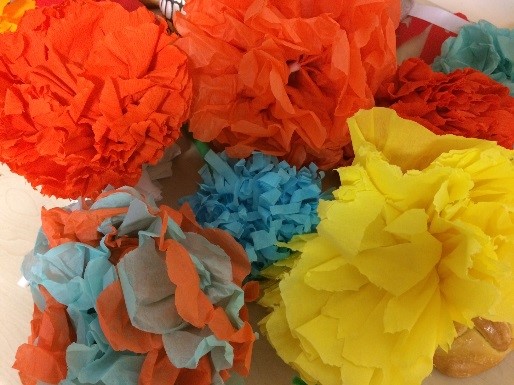Les mexicains décorent leur maison, les rues et la tombe de leurs défunts avec des fleurs. Les élèves qui le souhaitaient ont fabriqué des fleurs en papier destinées à décorer l’autel des morts.